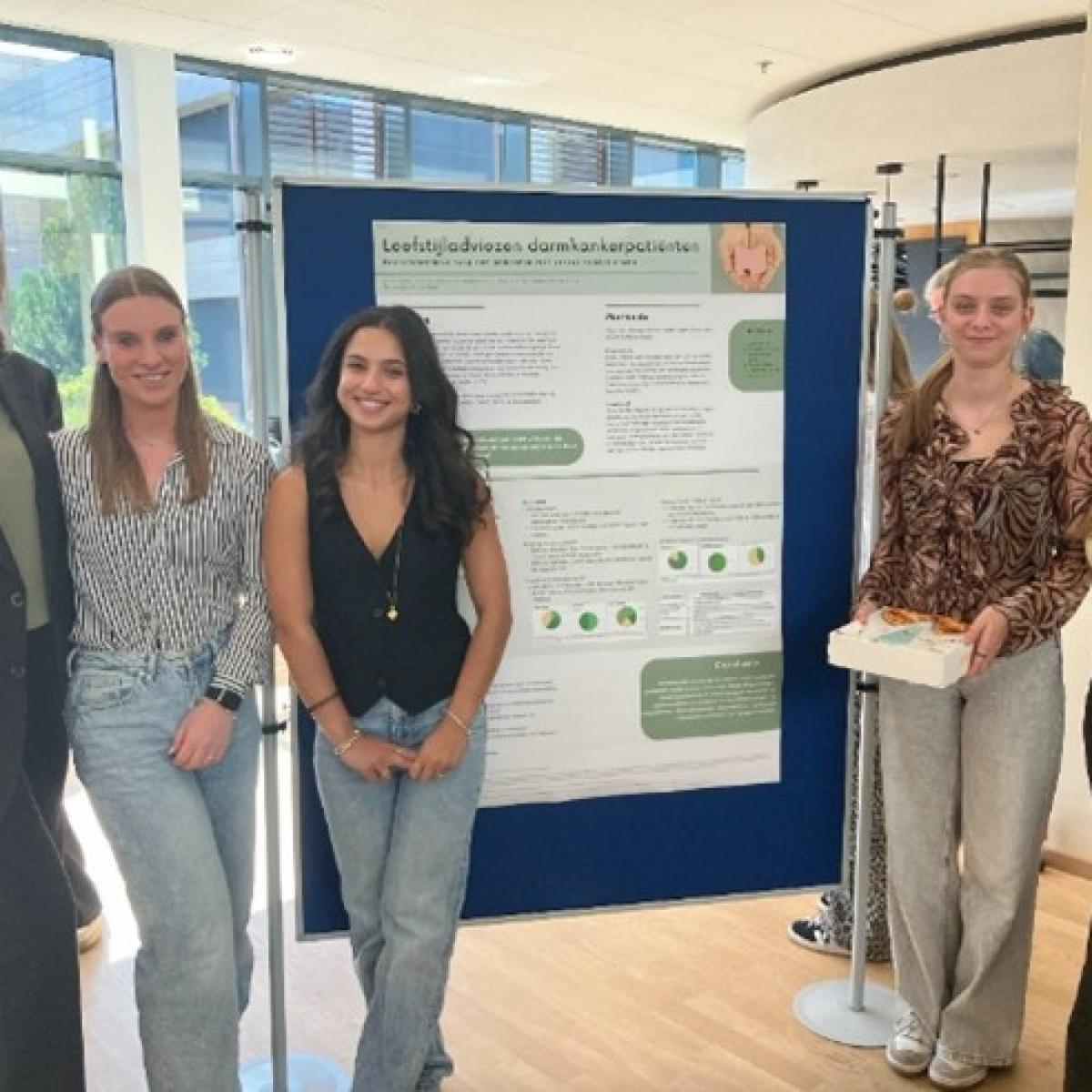 In het bijzonder willen we het project van de winnaars van de poster Award Sevda, Zoë, Lisan, Daphne en Eva van harte feliciteren! Met hun poster hebben ze helder toegelicht hoe ze onderzoek hebben gedaan naar leefstijladviezen bij darm kankerpatiënten. Uit hun onderzoek kwam naar voren dat patiënten met stoma tevredener zijn over nazorg dan patiënten zonder stoma. Beiden zouden echter meer gepersonaliseerde adviezen en structureler contact met de zorgverleners willen.