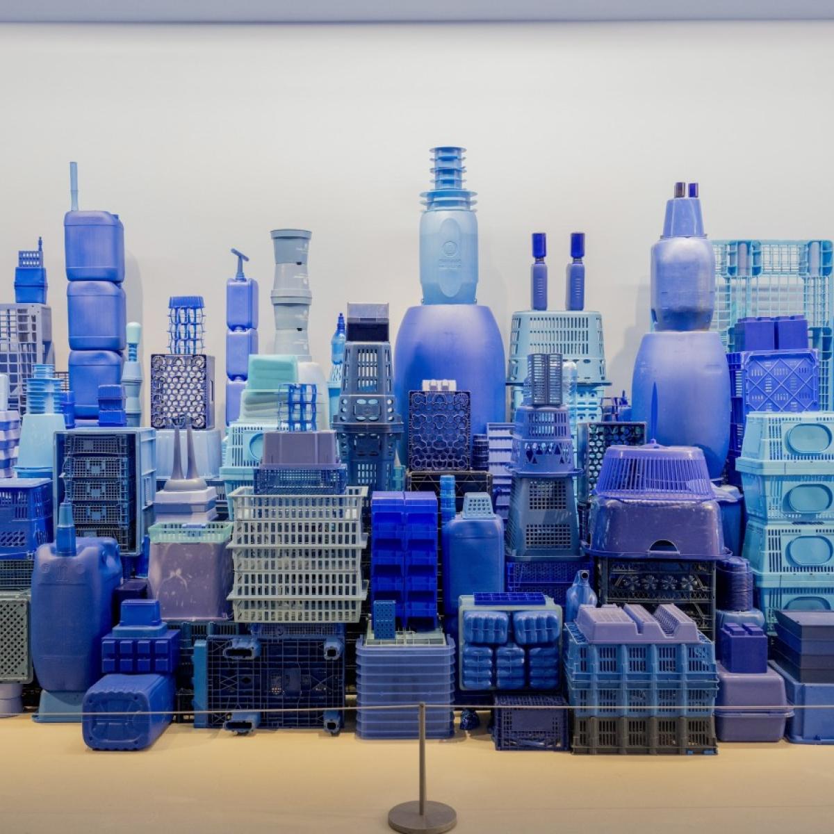 Aan het kunstwerk De Blauwe Stad mag je zelf meebouwen. Gebruik het plastic naast het kunstwerk als bouwblokken en draag op die manier bij aan het landschap waar de kunstenaar een aanzet voor heeft gegeven.