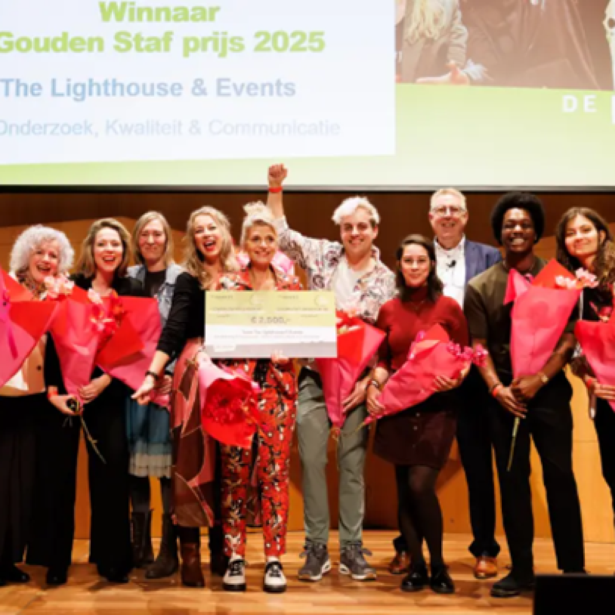 De Gouden Staf Prijs bekroont teams die een aantoonbare meerwaarde leveren aan het onderwijs- of onderzoeksproces. Dit jaar werd The Lighthouse & Events onderscheiden, vanwege hun verbindende rol binnen de hogeschool, hun bereidwilligheid en de impact van hun evenementen.